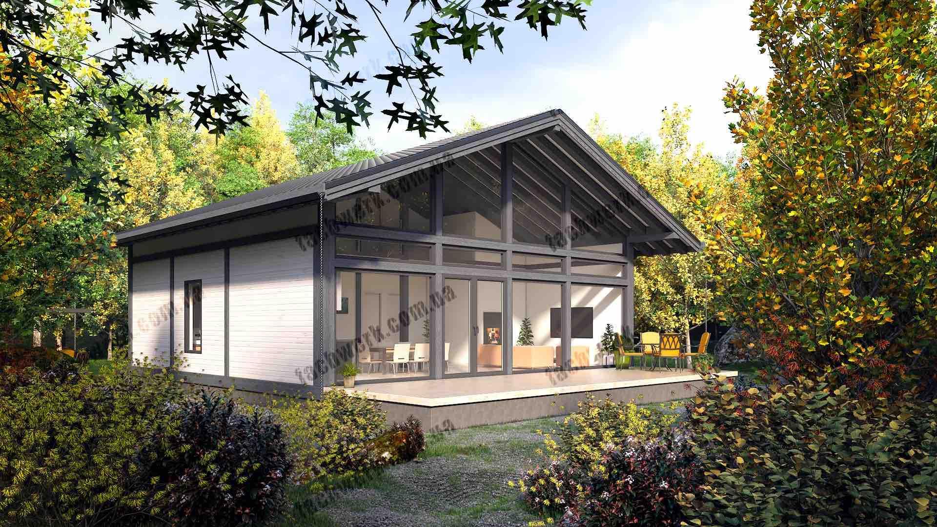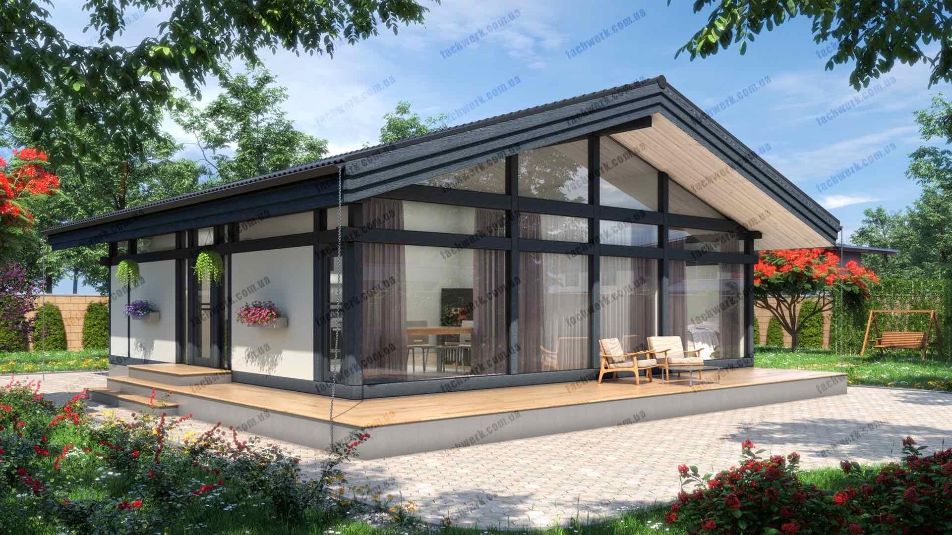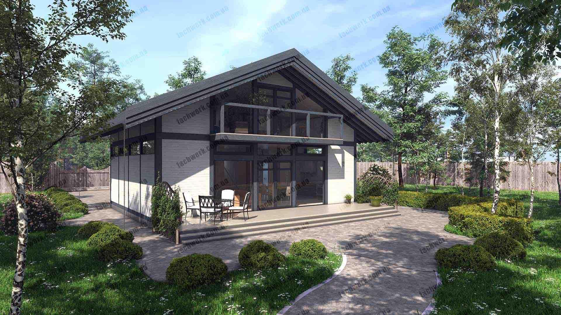 Фахверковий будинок у стилі Модерн має панорамну оглядовість у вітальні, з "подвійним світлом", та власне подвір'я - тераса, схована від чужих очей або вітру. Підходить як для заміського котеджу, так і в умовах щільної міської забудови.
