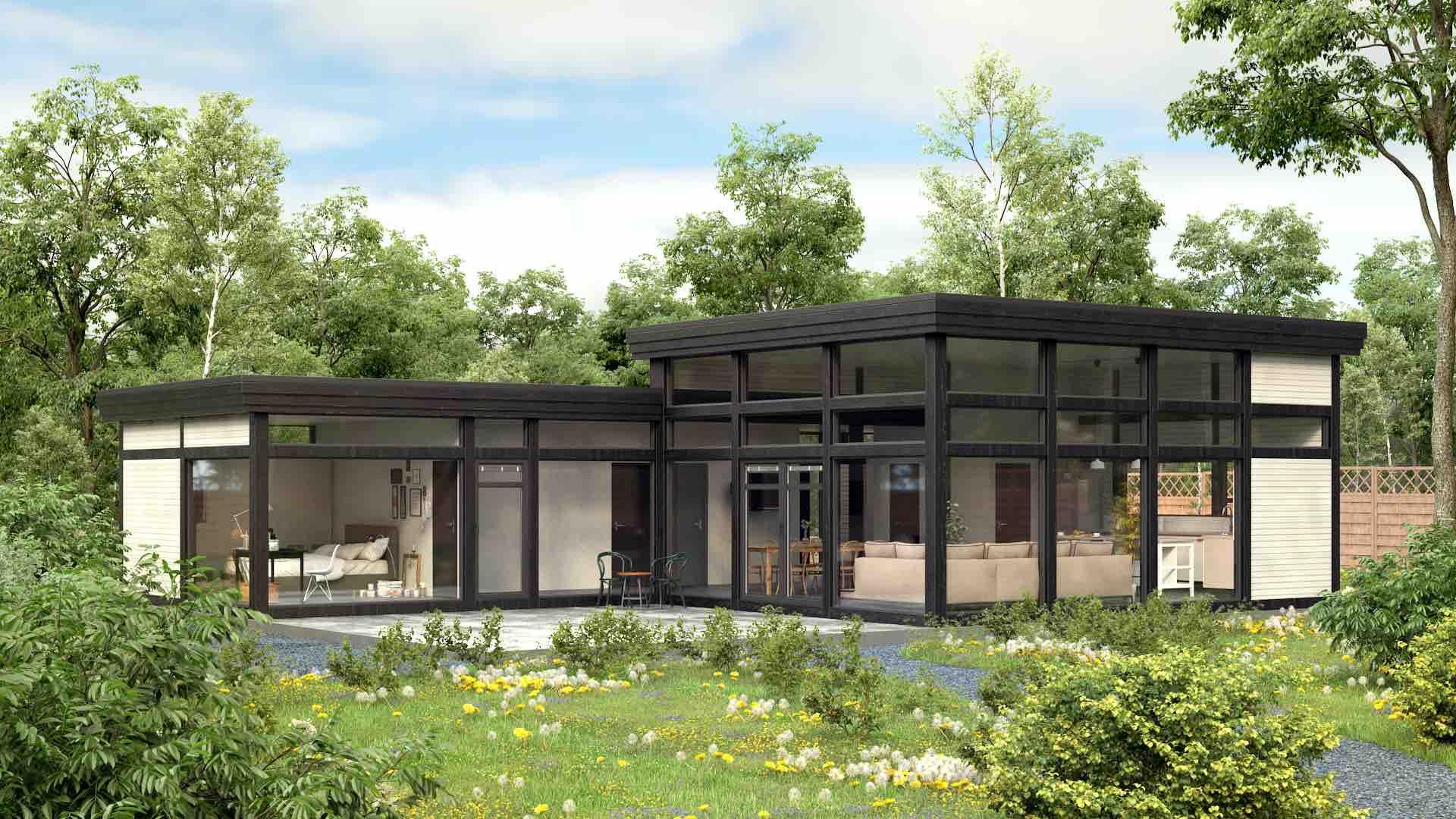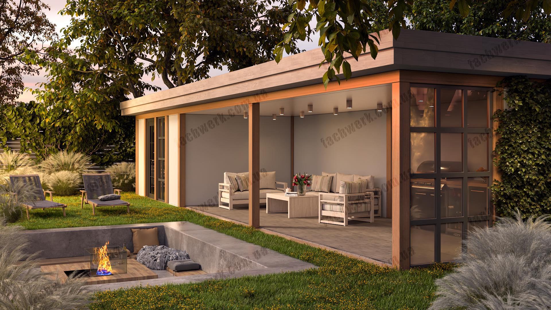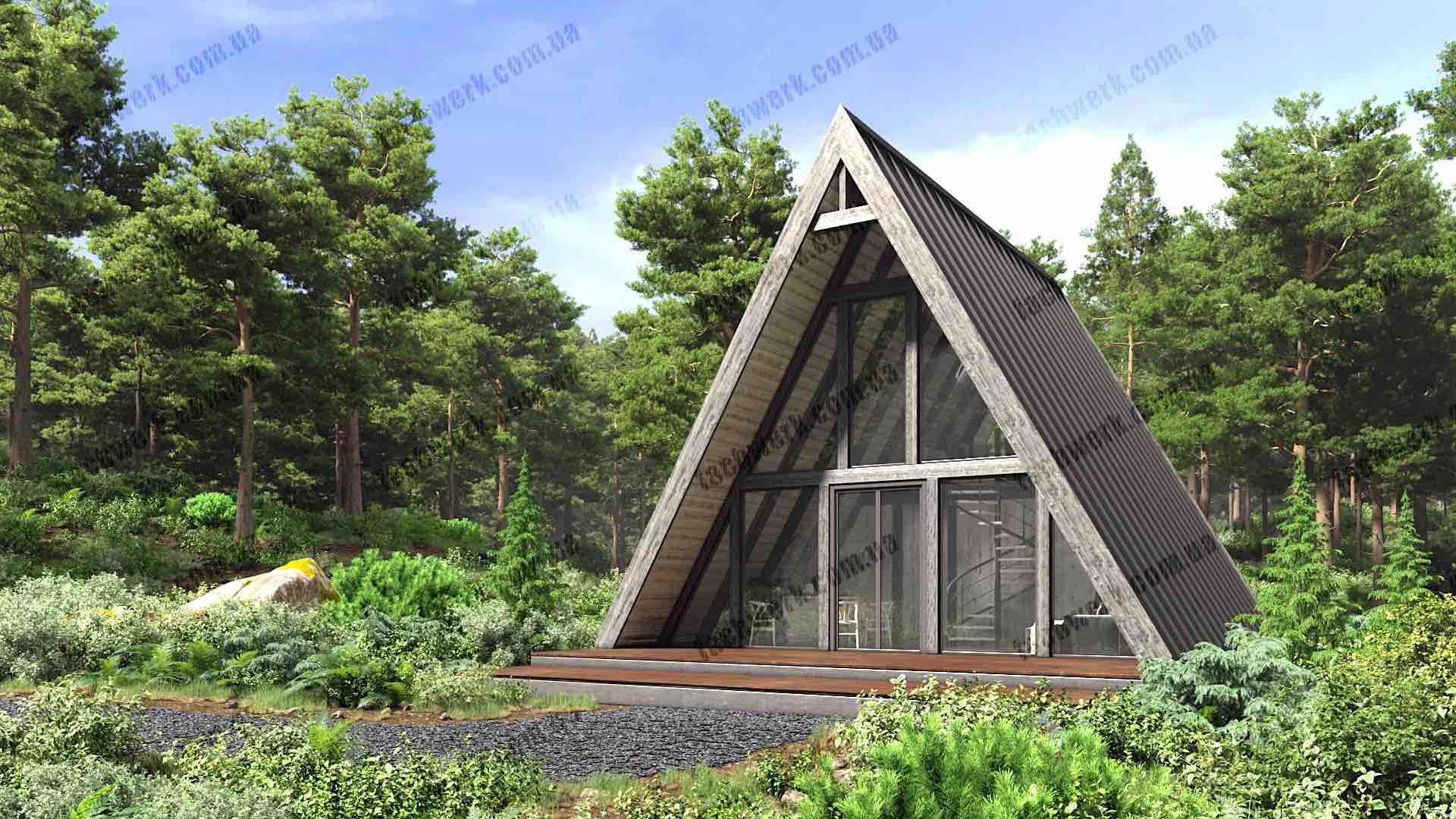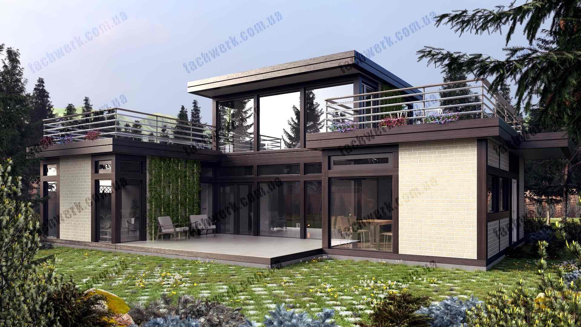 Фахверковий будинок у стилі Модерн має панорамну оглядовість у вітальні, з "подвійним світлом", та власне подвір'я - тераса, схована від чужих очей або вітру. Підходить як для заміського котеджу, так і в умовах щільної міської забудови.