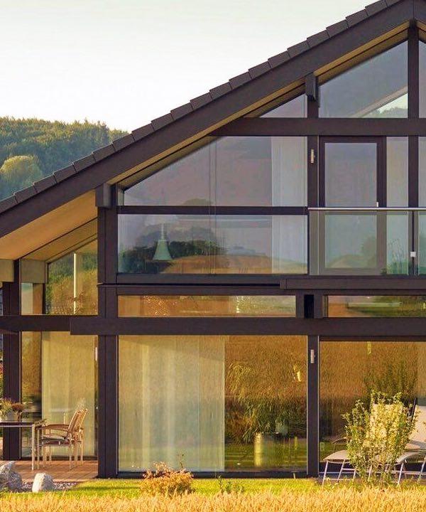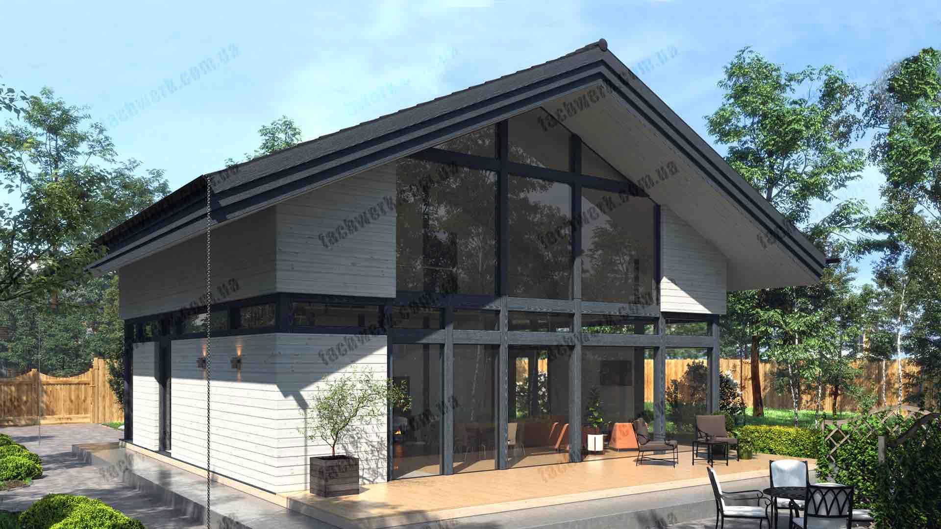 Каркасно-фахверковий будинок в стилі Шале. Ця змішана технологія має всі переваги фахверку за менші кошти. Cкляна частина будинку з клеєного брусу з панорамними вікнами, інше зі струганого дерев’яного масиву.