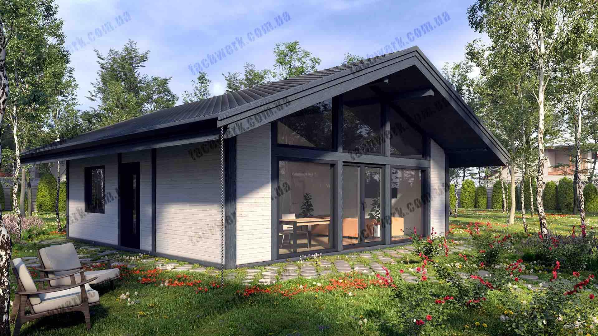 Фахверковий будинок у класичному стилі Шале має велику вітальню з другим світлом, велику генеральну спальню. Проект облаштований панорамними вікнами та зручною терасою. Ергономічно, стильно, сучасно і зручно.