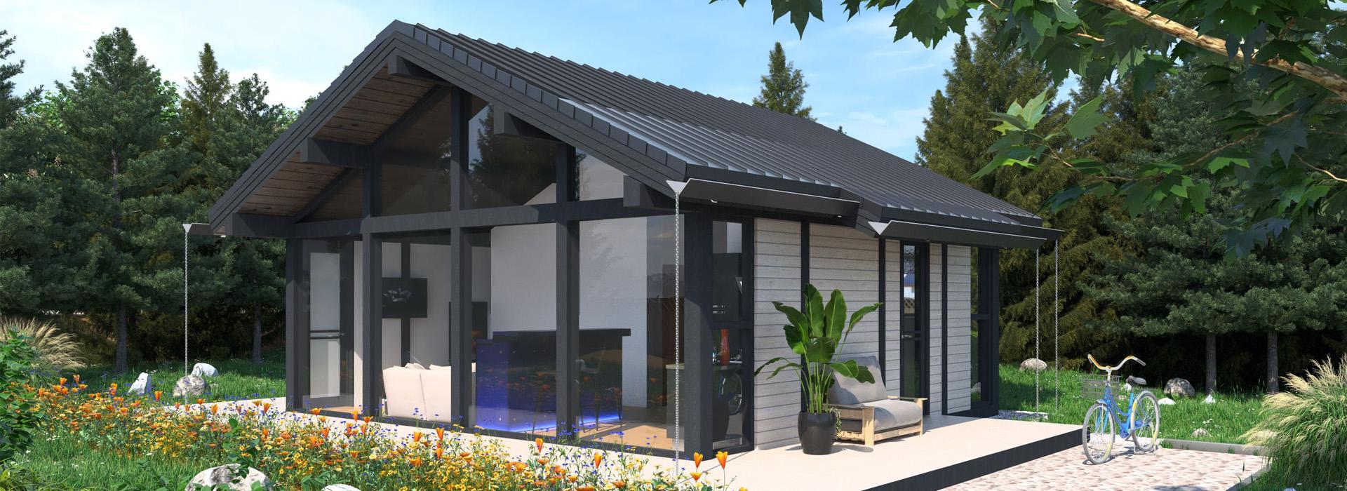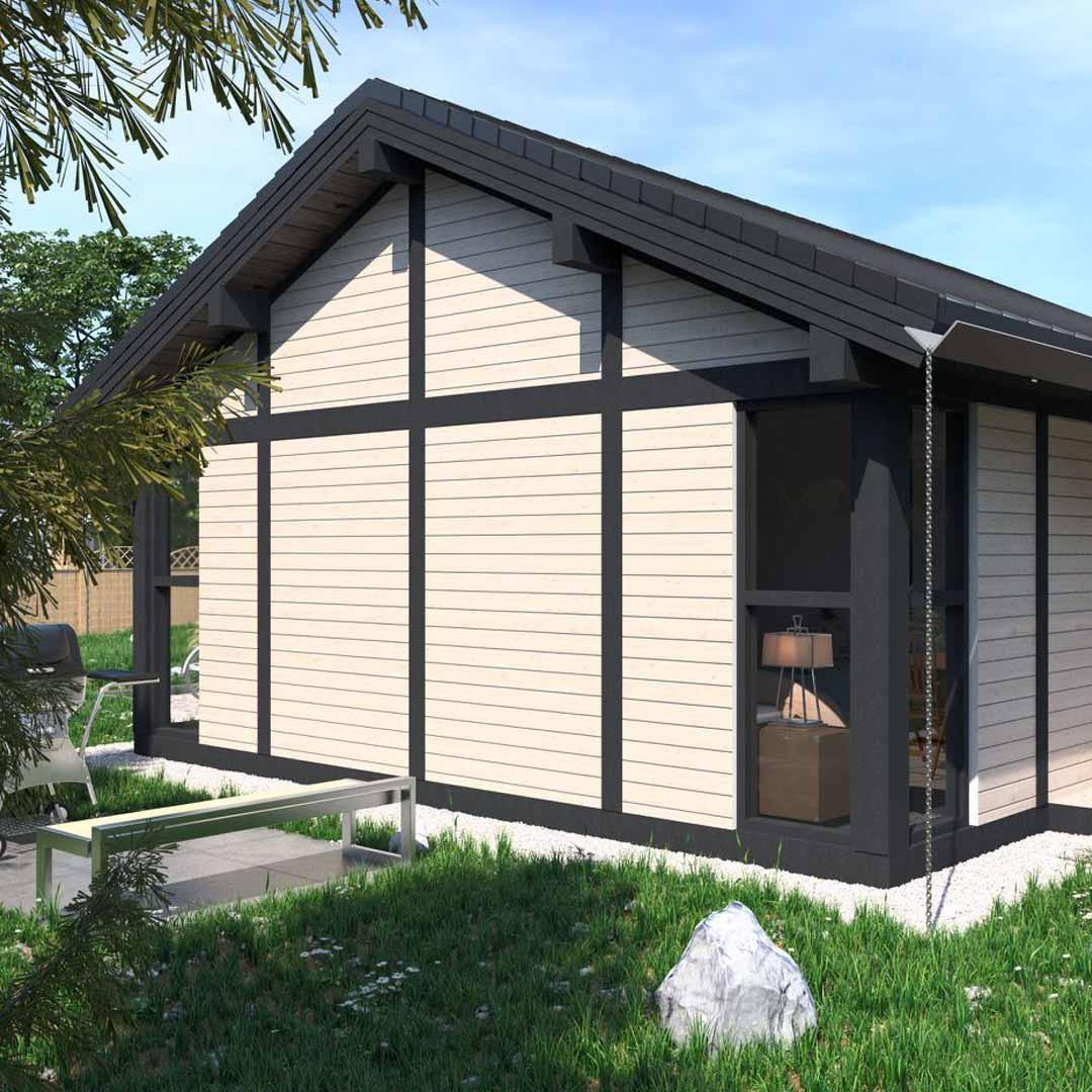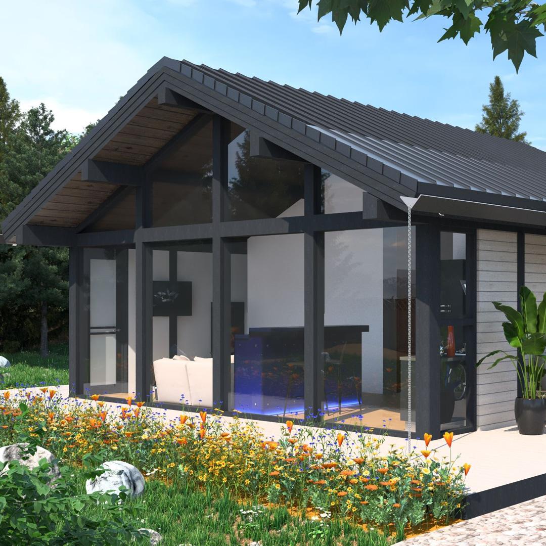 - Завдяки конфігурації покрівлі, яка нависає над панорамним склінням та передньою терасою, виходить відчутна тінь влітку в будинку, а також захист садових меблів у дощові дні на терасі, що додає затишку та зручності користування.