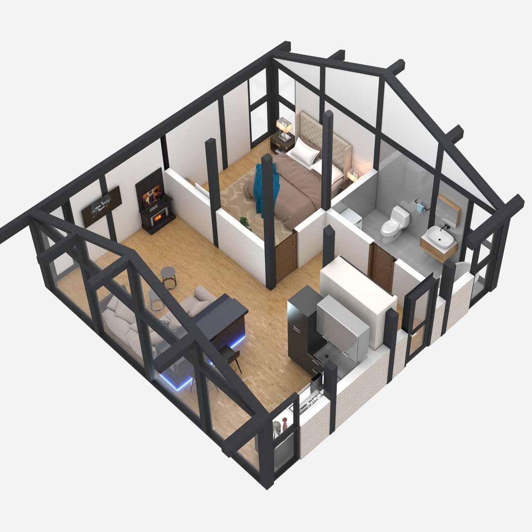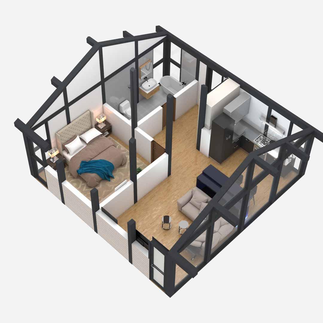 - Невеликий, але місткий будинок, при цьому є все необхідне, вітальня з другим світлом, спальня і великий санвузол. Зручна тераса з виходом з кухні-студії, горищне приміщення для зберігання речей. Максимально ергономічно, стильно, сучасно.