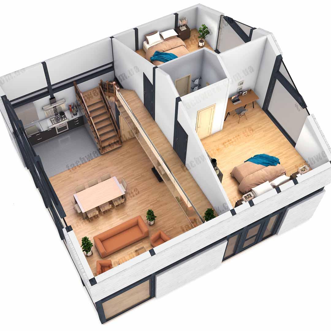 - Компактний двоповерховий будинок у класичному стилі з просторими кімнатами, "подвійним світлом" та високими стелями у вітальні, з ергономічним другим поверхом у 2х варіантах планування.